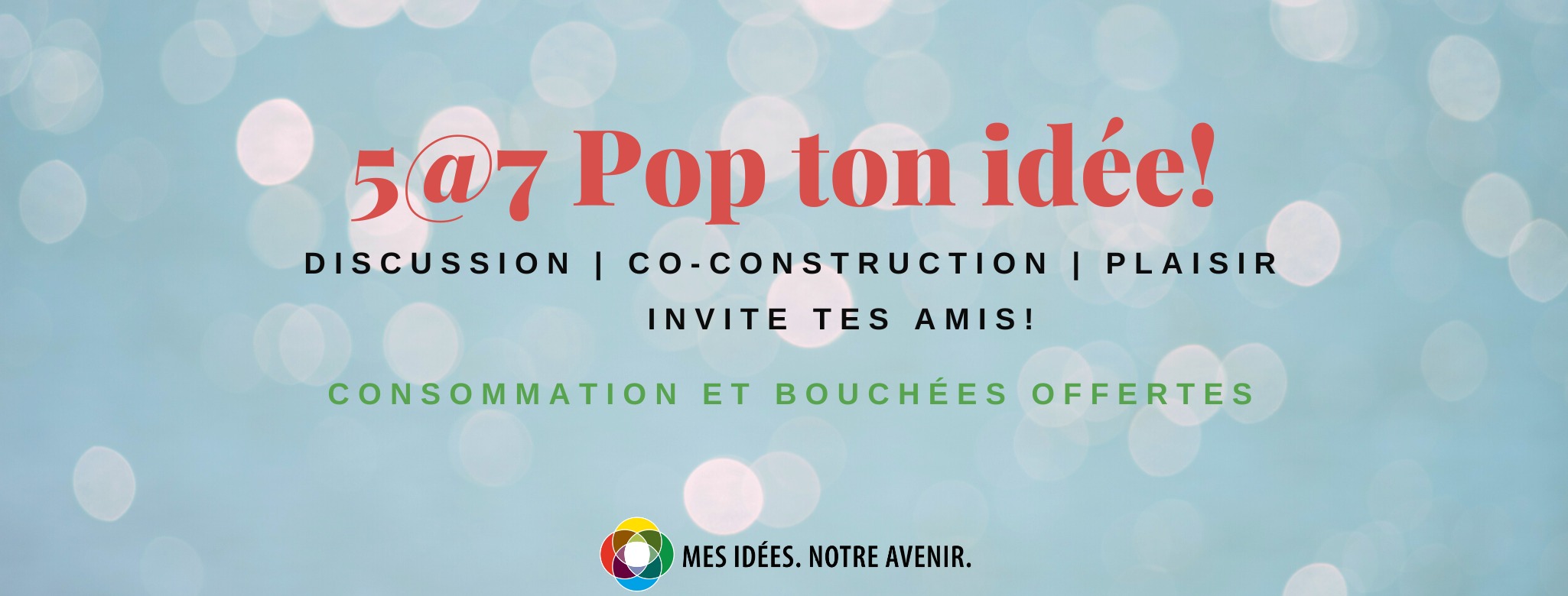 Dans le cadre de la démarche Mes idées.Notre avenir. participe au 5 à 7 et viens discuter d'enjeux collectifs et ainsi faire "popper" une idée qui pourrait devenir réalité. Dépôt d'idée en ligne sur place ---> Consommation supplémentaire offerte à ceux qui déposeront une idée le soir même!